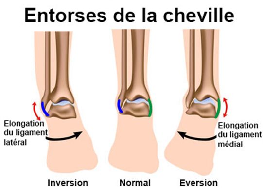 En effet, il existe deux types d’entorse de la cheville, selon le sens de rotation de la cheville : l’inversion (pied tourné vers l’intérieur) et l’éversion (pied tourné vers l’extérieur, plus rare). Je parlerais principalement de l’entorse de la cheville par inversion.